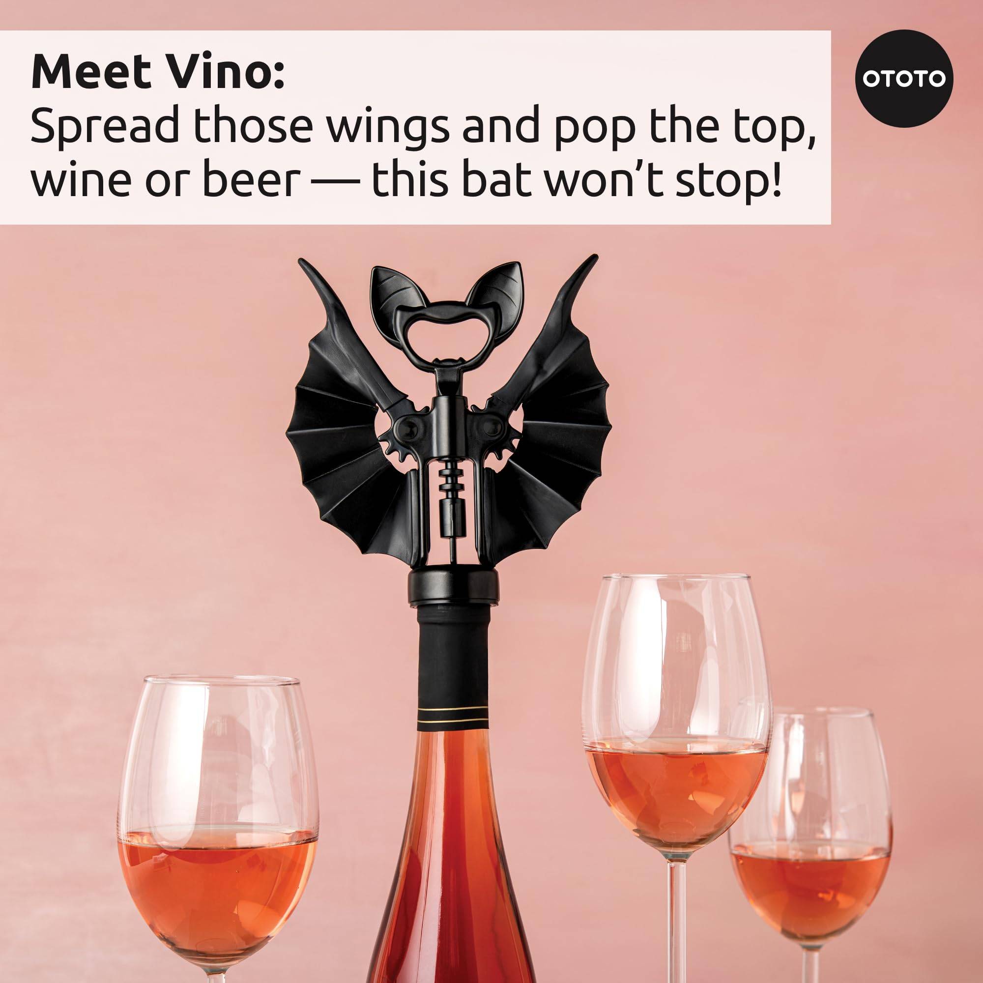 OTOTO Vino bat-shaped corkscrew on wine bottle with wings spread, surrounded by wine glasses. Fun Halloween wine opener for kitchen or bar use.