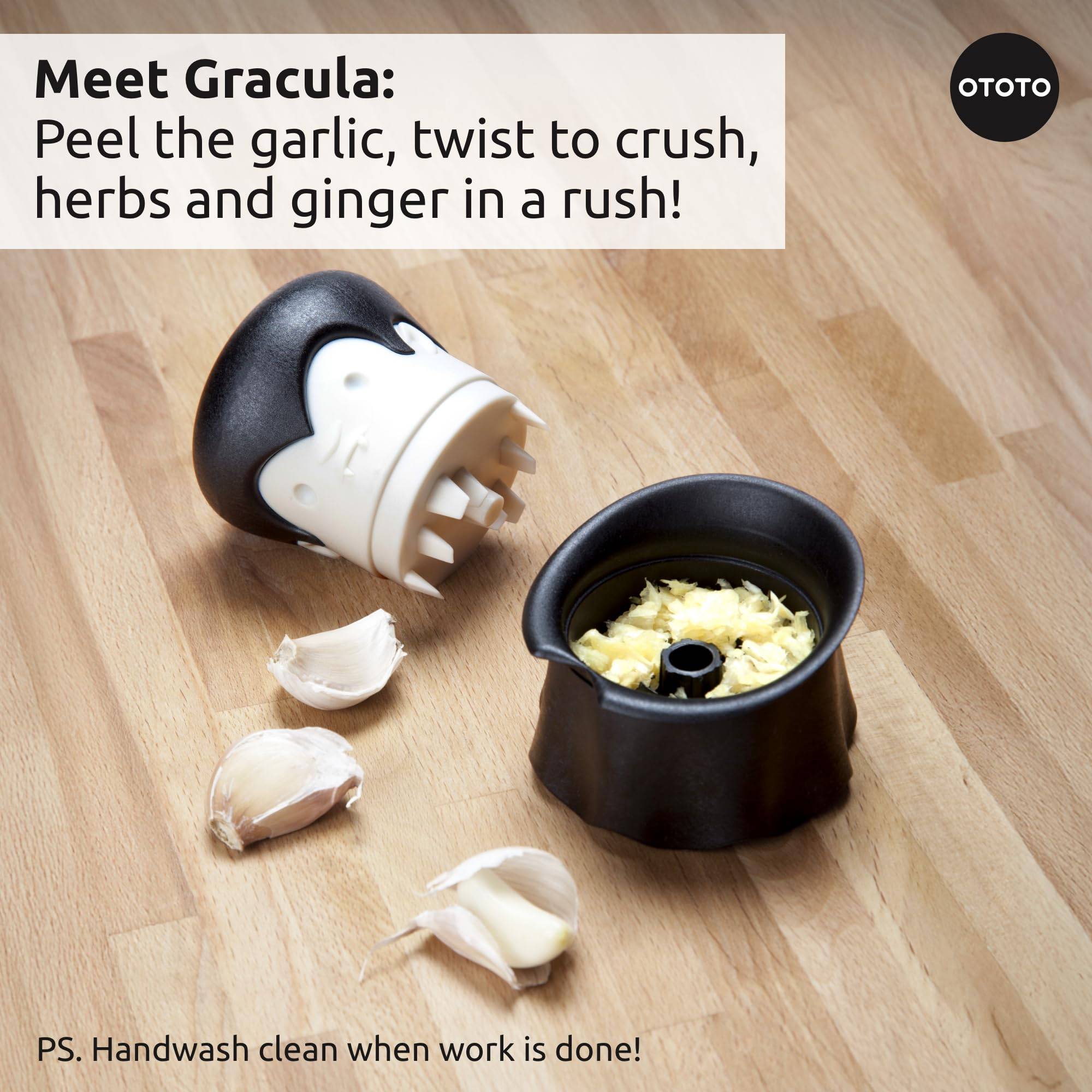OTOTO Gracula garlic crusher with vampire design on wooden counter, shown crushing garlic cloves. Fun Halloween kitchen gadget for easy prep.