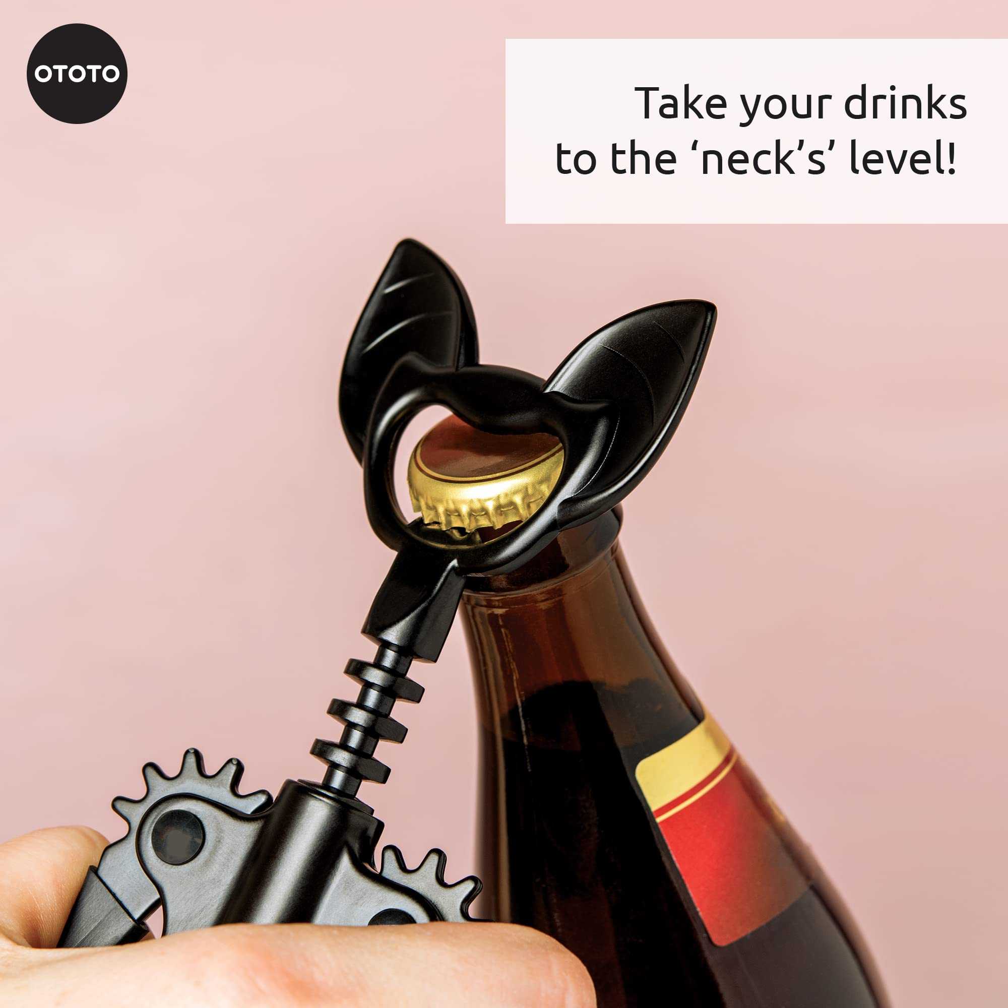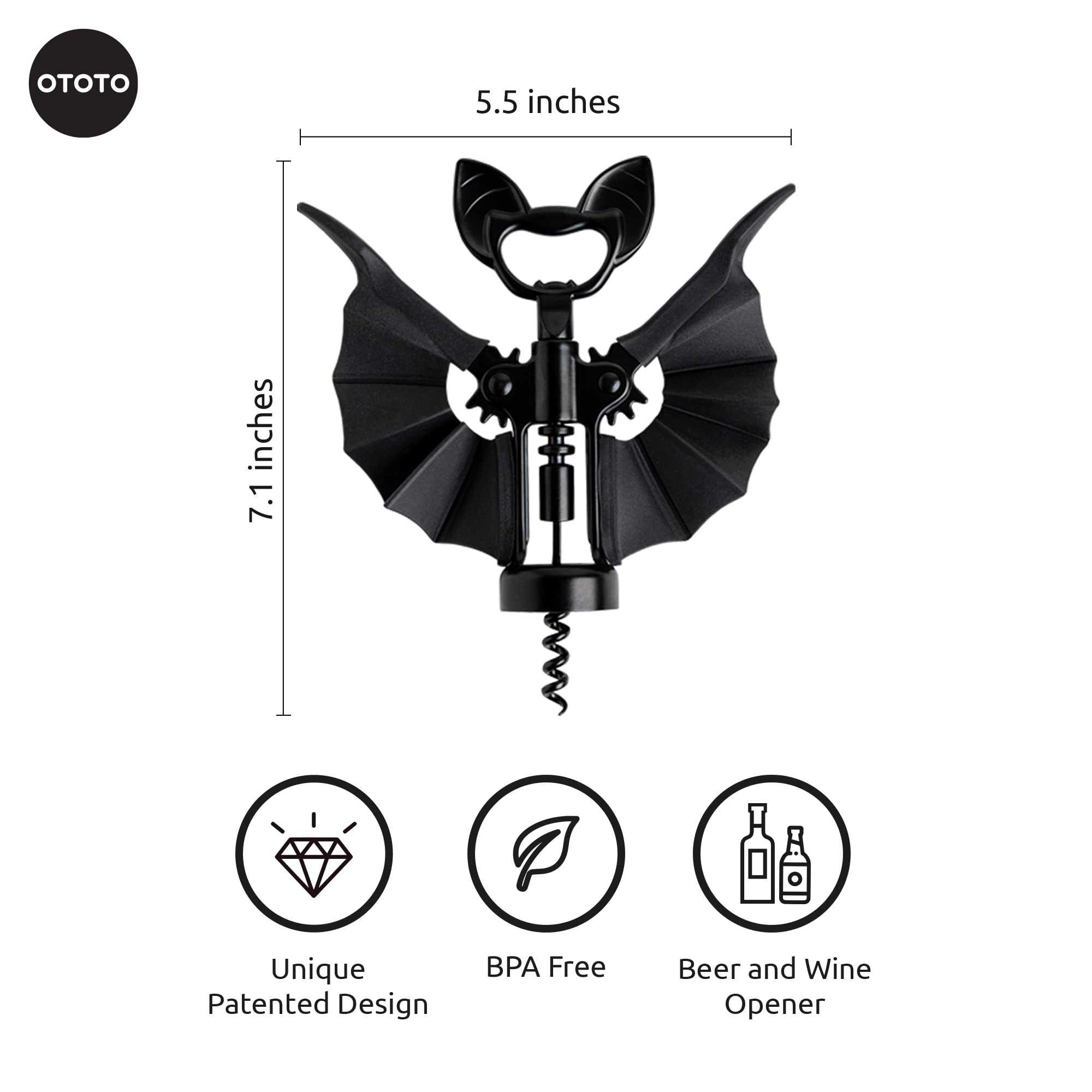 - Meet Vino, the bat - From the Design Awarded Studio OTOTO, we bring you Vino, the Bat! Grab the wine and don't hold back; Vino keeps your night on track! Vino makes the perfect gifts for wine lovers! Opens corks easily without pain; treat yourself to a glass of wine or two, for this bat is here as your trusty corkscrew. Add him to your collection of cute kitchen tools and gadgets and you're all set!
